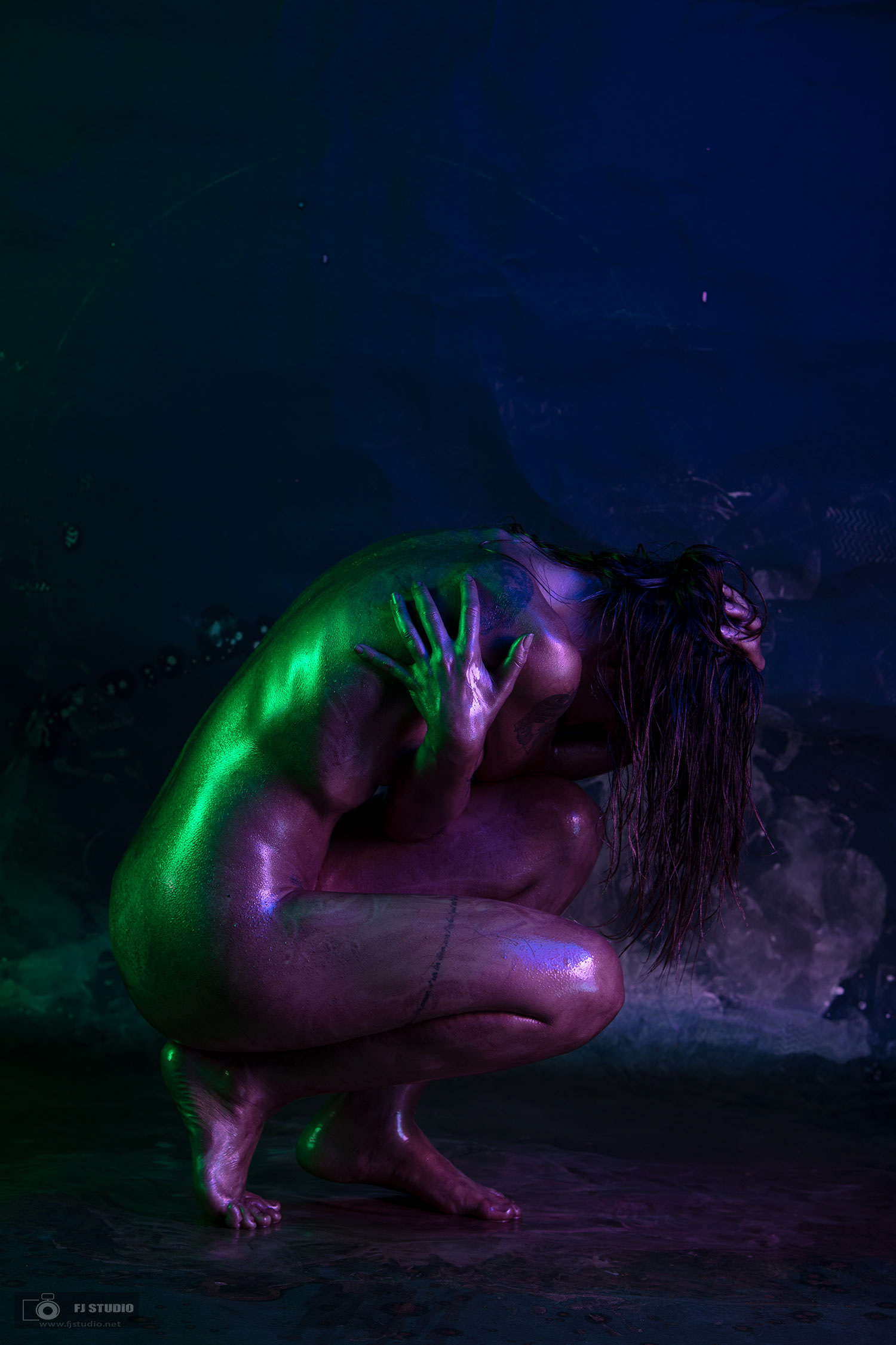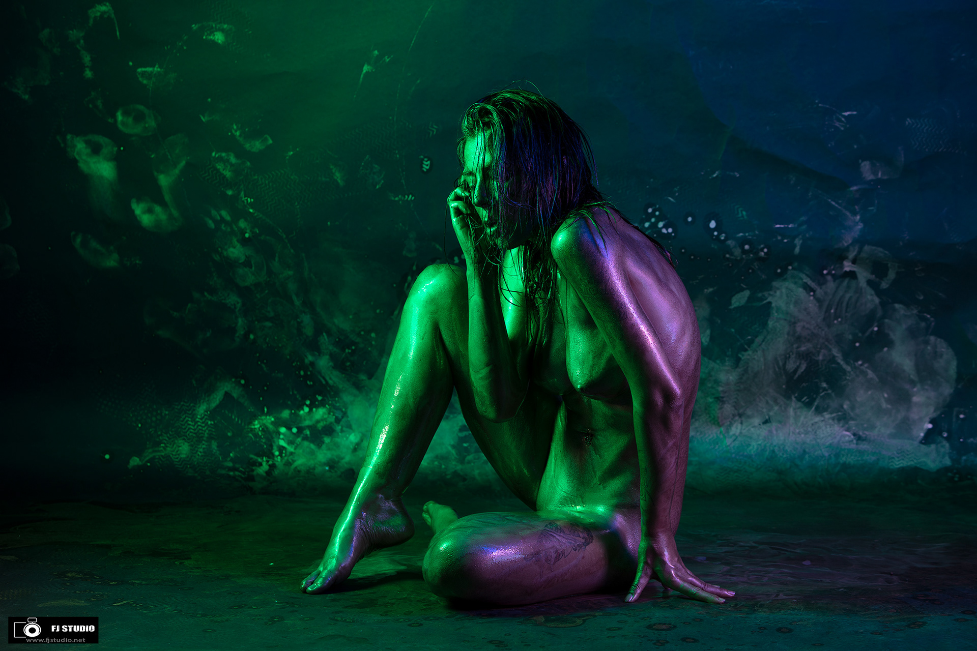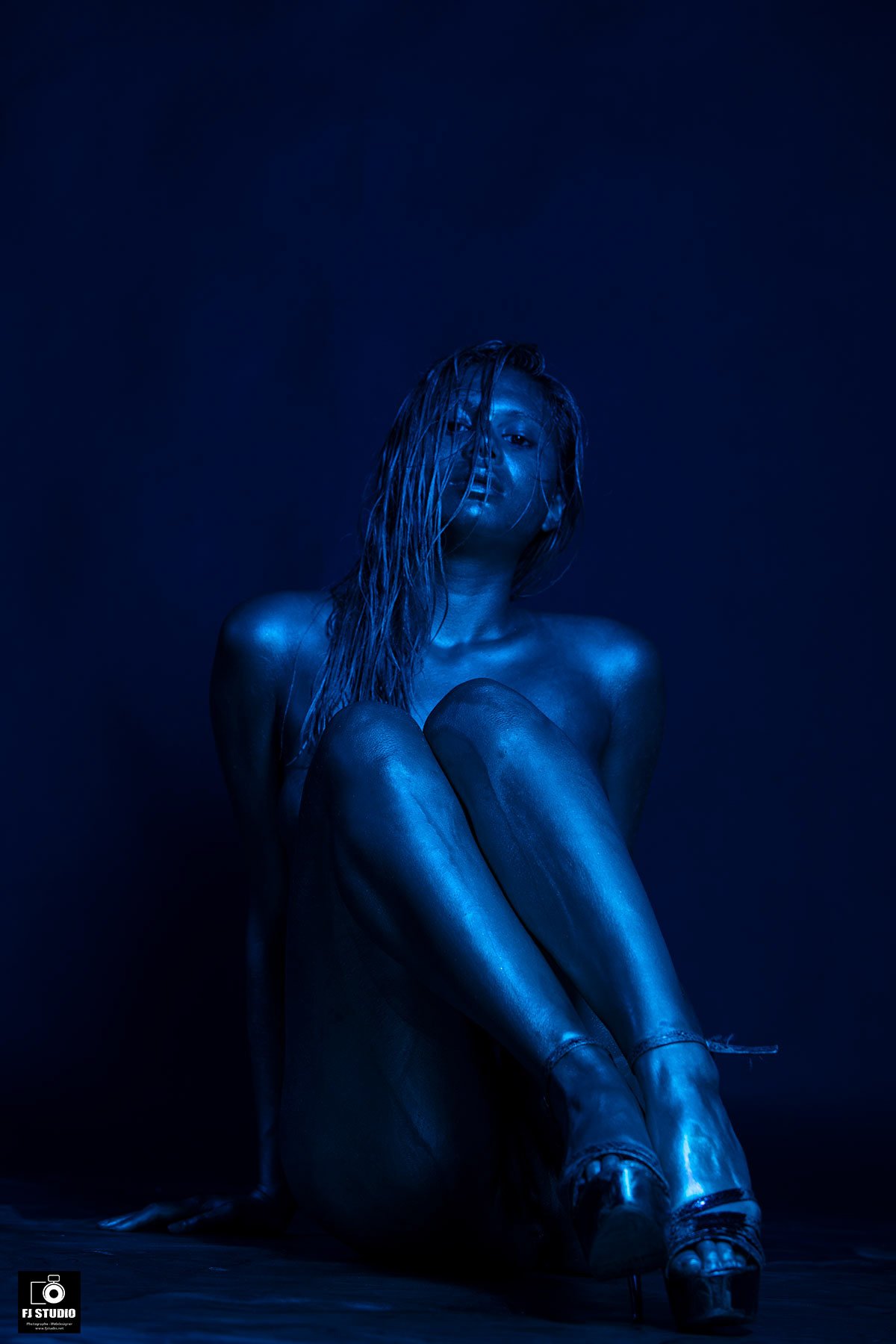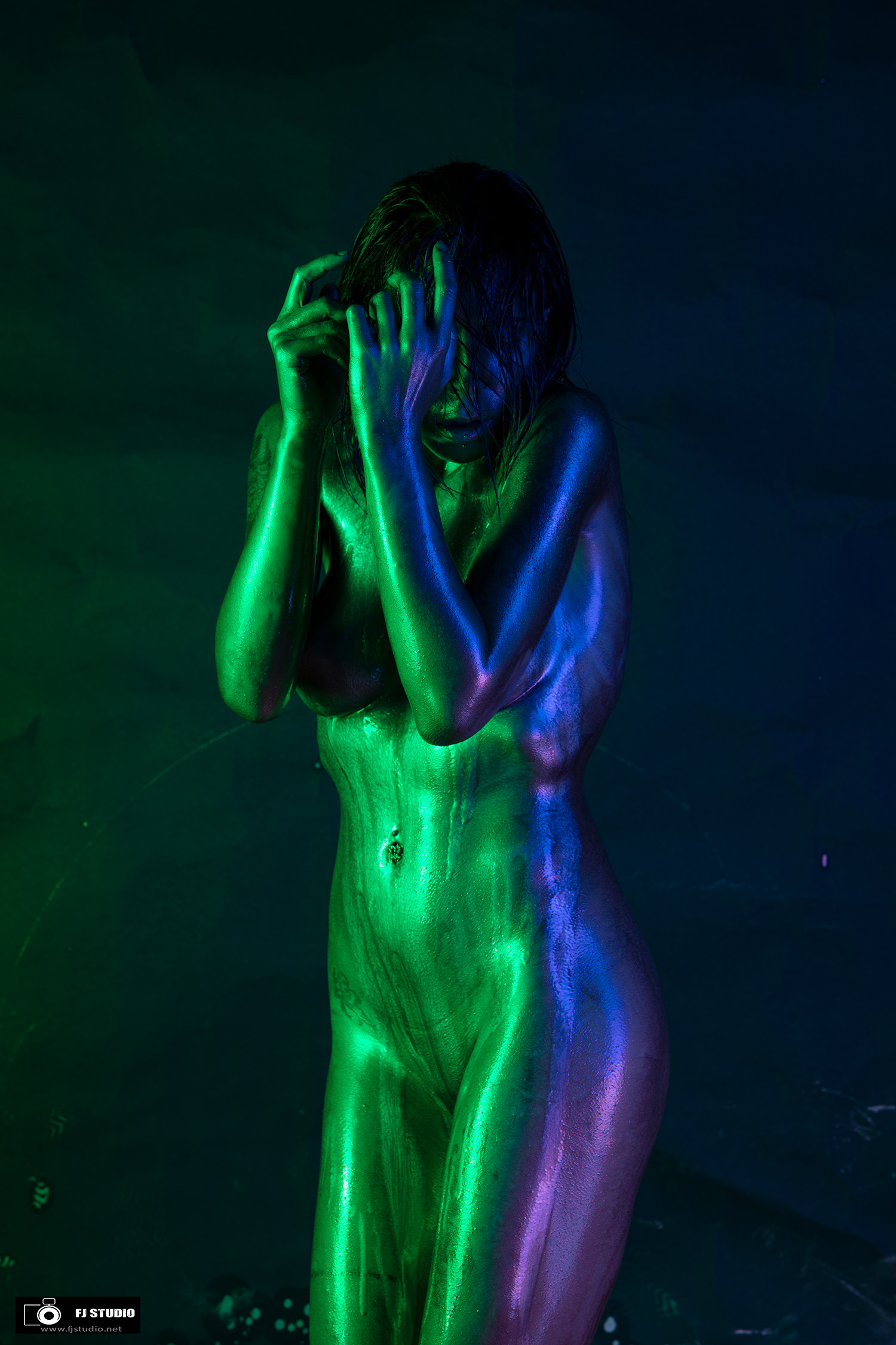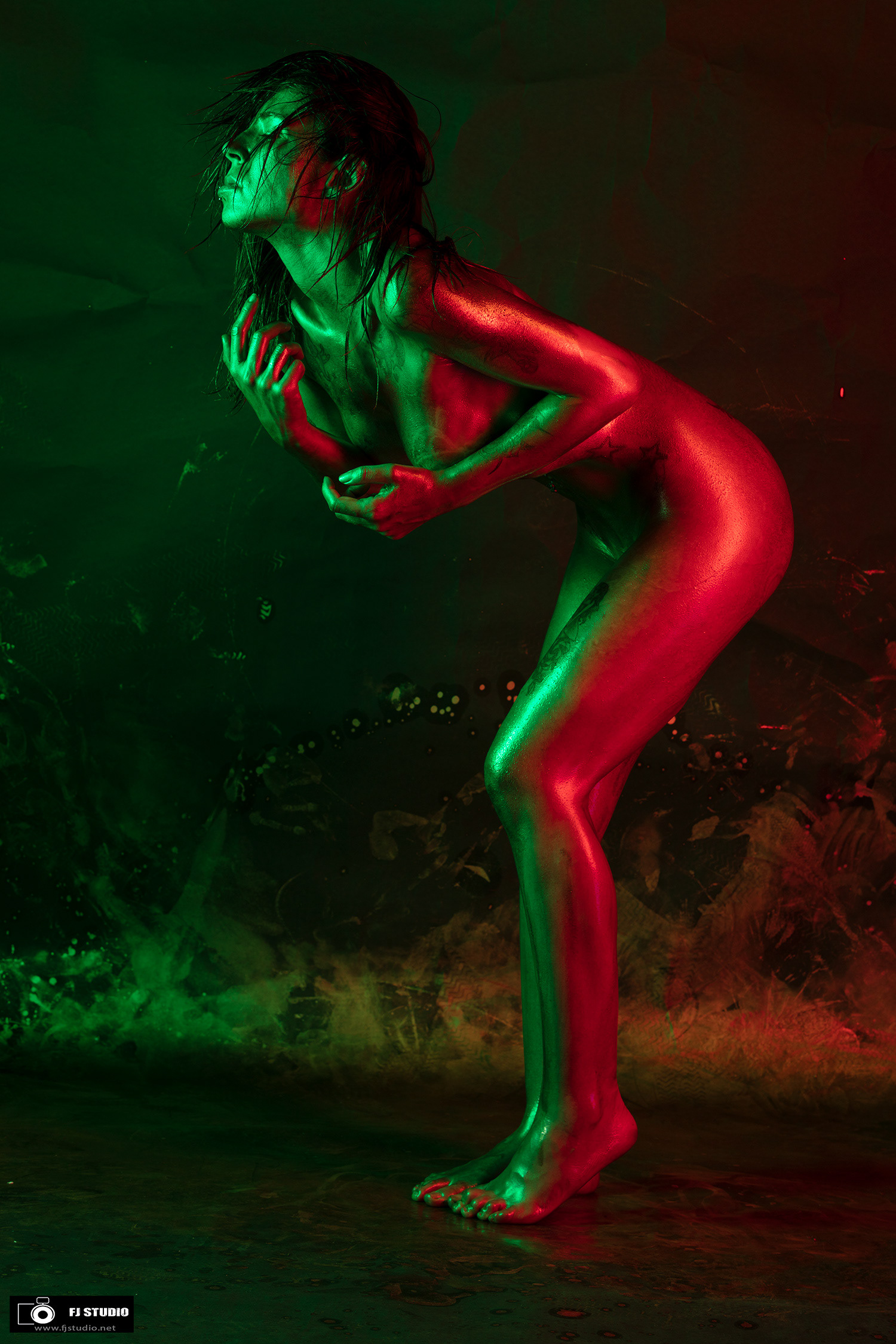 Les modèles sont recouverts d'une "peinture" dorée sur tout le coprs, le fond à préalablement été préparé avec des projections de la même peinture, l’éclairage colorisé avec des gélatines apposées devant les torches